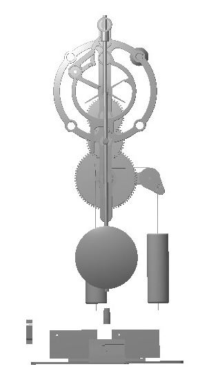 It was inspired by a model I spotted on the website of a company called JBV Creative . It was a simple bare escapement designed to be wall mounted and hand wound. The owner sells stl files for his models so l purchased a set for the princely sum of $8 CAD and printed them out on my Creality Ender3 printer. To my surprise the little mechanism ran quite well using its simple drum and threaded weight. It had a run time of a few minutes.